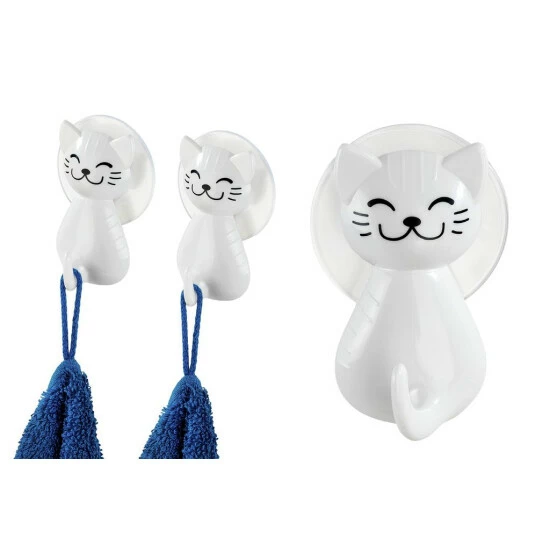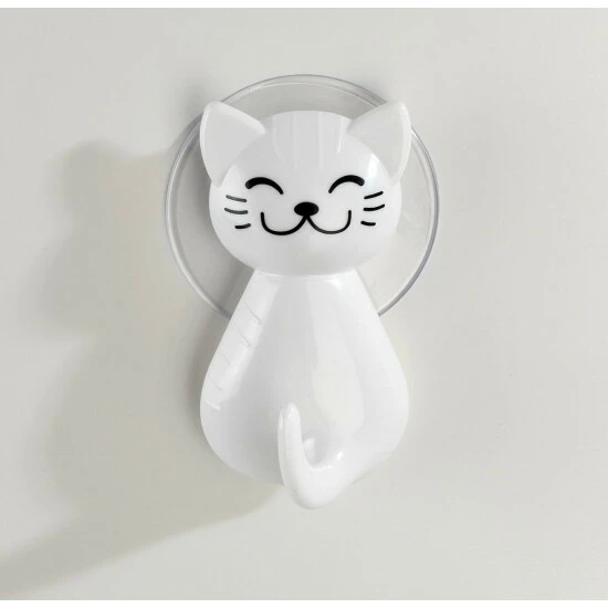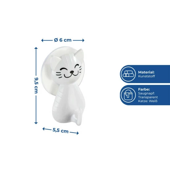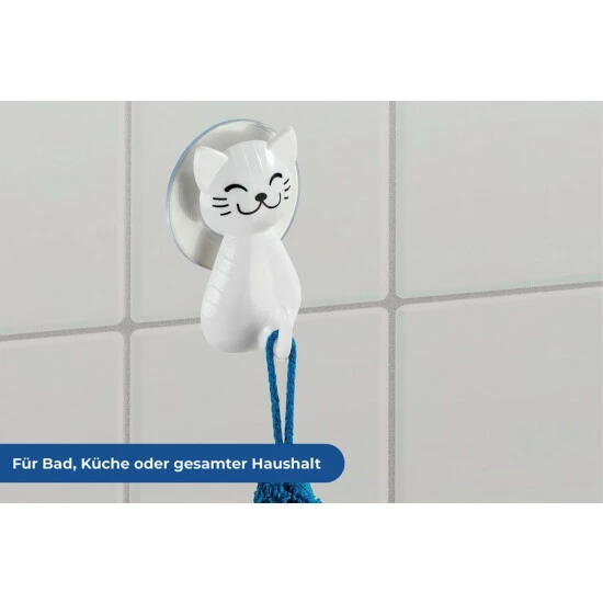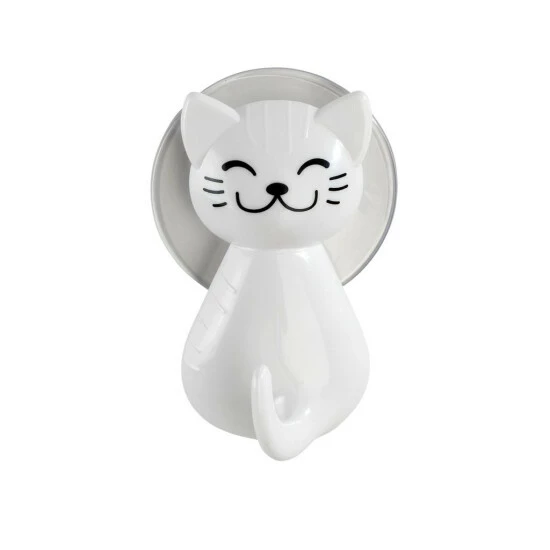 CAT Saugnapf-Aufhänger verfügt über ein Katzenmotiv. Das Produkt fällt ins Auge und wird ein Lieblingsartikel in Ihrem Kinderbadezimmer sein. Das Zubehör ist mit Saugnäpfen montiert, und kleine Abmessungen (6 x 5,5 x 9,5 cm) machen den Kleiderbügel auch in die kleinsten Badezimmer passen. Es ist erwähnenswert, dass das Markenprodukt von WENKO aus Kunststoff besteht, so dass es vollständig resistent gegen Feuchtigkeit und versehentliches Überschwemmen ist.