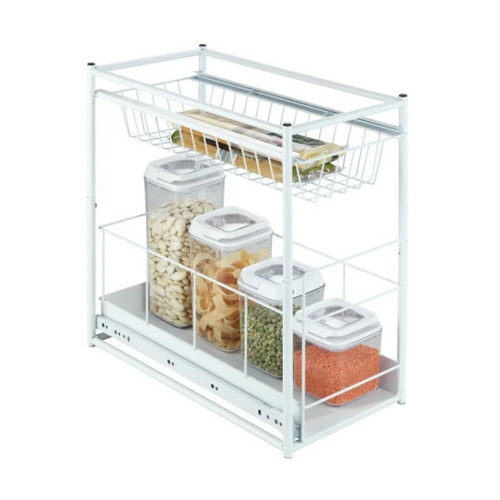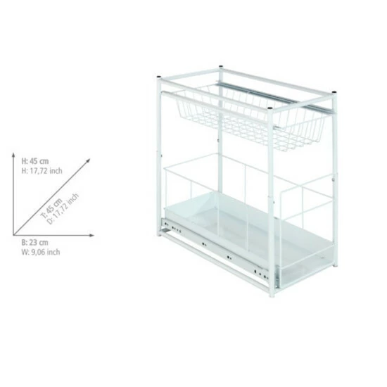 Das einziehbare Küchenregal von WENKO zeichnet sich durch zwei Ebenen aus, die Behälter mit Schüttgütern, Gewürzen oder Flaschen aufnehmen können. Sie können das Regal in den Schrank stellen und die Funktionalität der Schublade erwerben lassen. Das Accessoire besteht aus hochwertigem Metall und wird daher viele Jahre lang dienen.