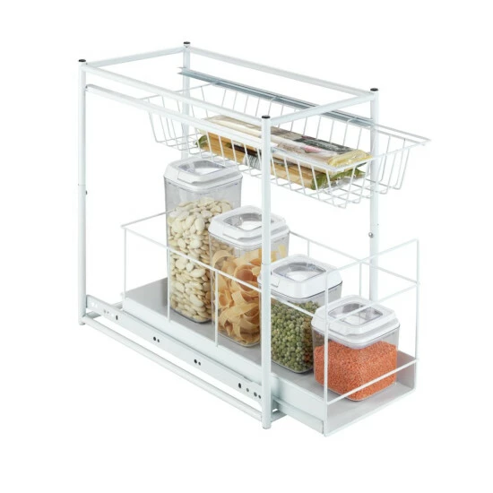 Sollte der Stauraum in der Küche mal eng werden, bietet der Schrankauszug mit zwei Fächern eine gelungene Lösung. Ideal zum Nachrüsten für den Küchenschrank, schafft der Schrankauszug zusätzlichen Platz und Ordnung.
