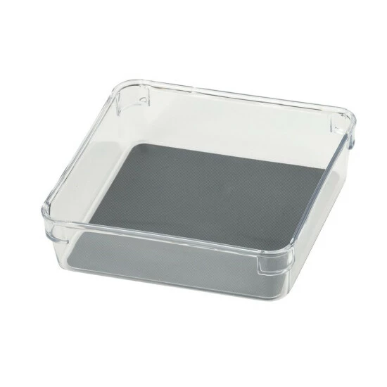 Im modernen Design aus hochwertigem, grau-transparentem Kunststoff gefertigt passt die quadratische Box in jede handelsübliche Schublade.