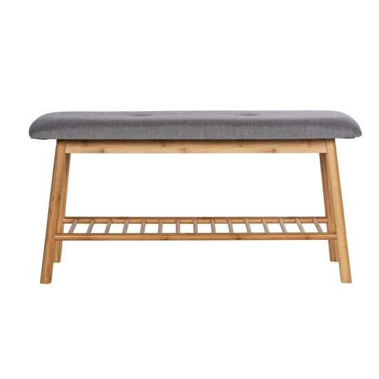 Die Bank mit einem Regal für Schuhe ist trotz ihrer geringen Größe ziemlich geräumig – sie bietet Platz für etwa 4 – 6 Paar Schuhe. Stilvolles und einfaches Design dieses modernen Schuhschranks ermöglicht es Ihnen, es in Innenräume mit unterschiedlichem Charakter in Bezug aufNachbildung zu passen, die mehr und weniger auf aktuelle dekorative Trends modelliert sind. Modische graue Farbe in Kombination mit Bambus wird eine moderne Arrangement-Ergänzung darstellen.