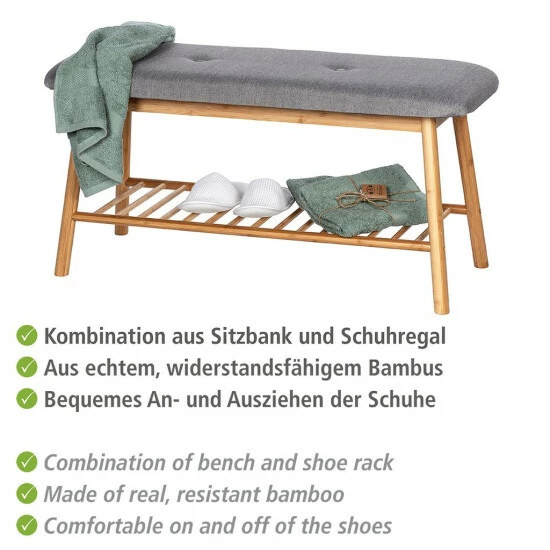 Flurbank mit BAHARI Schuhregal Bambus der deutschen Marke WENKO ist eine außergewöhnlich praktische und geschmackvolle Ergänzung zu Ihrem Flur, die dazu beiträgt, Schuhe unterzubringen und gleichzeitig die Funktion eines Sitzes zu erfüllen. Er vereint die Funktion eines Schuhorganisators und eine bequeme und nützliche Bank in jedem Haus, bezogen mit elegantem und robustem Material. Solch ein moderner Schuhschrank wird die Funktionalität Ihres Flurs oder Ihrer Garderobe verbessern und das Interieur schön stilvoll gestalten.