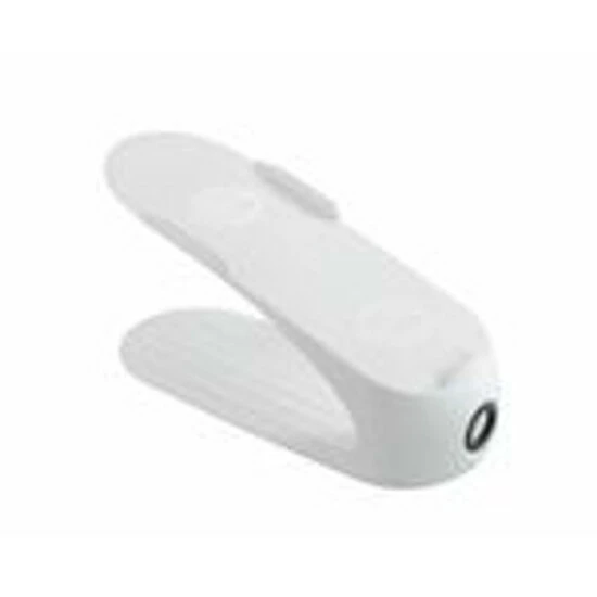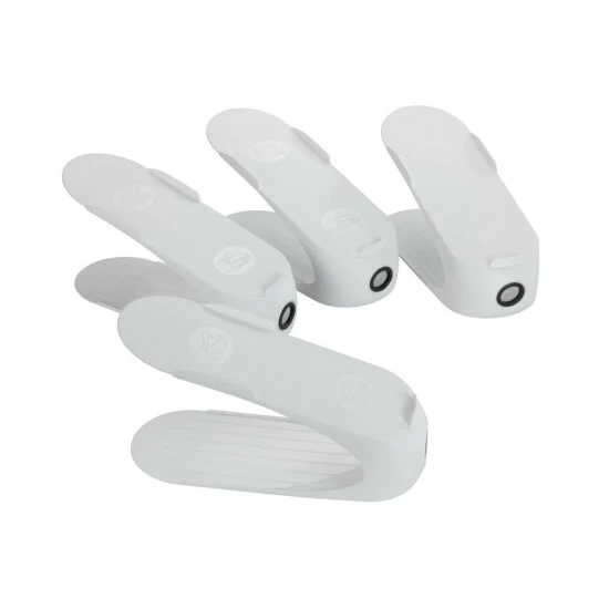 Der Schuhhalter besteht aus stabilem Kunststoff in klassischem Weiß und ist mit einem praktischen, grauen Griffloch für leichtes Entnehmen ausgestattet. Die Lieferung enthält 4 Schuhalter.