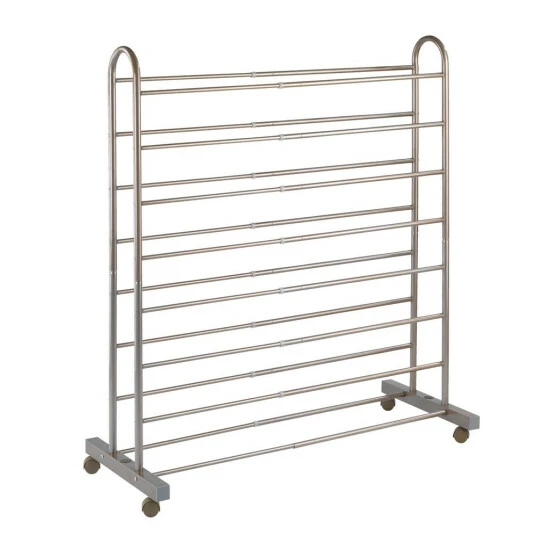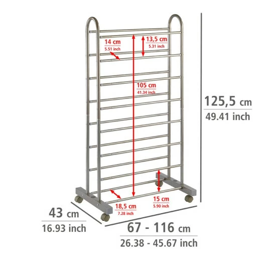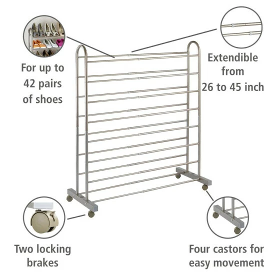 Das Schuhregal verfügt über eine flexible Teleskopfunktion (ausziehbar von 67 bis 116 cm) und vier Rollen zum leichten Fortbewegen mit zwei Feststellbremsen.