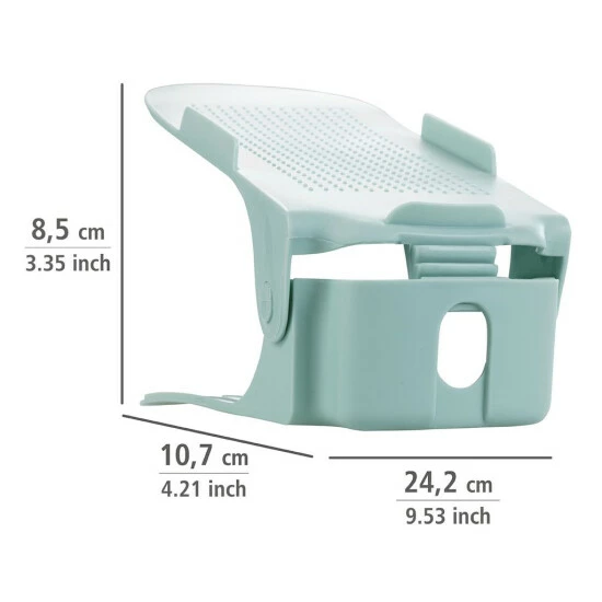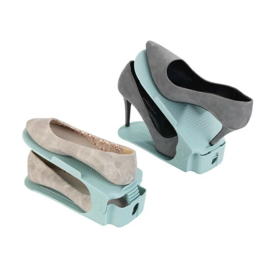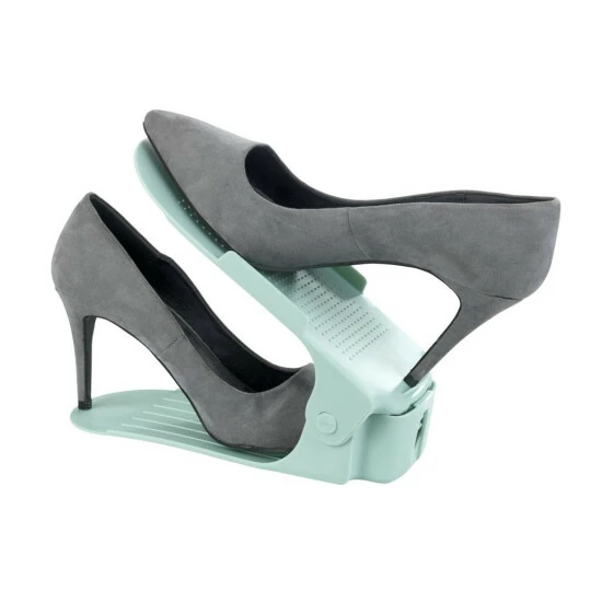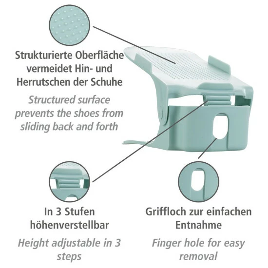 Der Schuhhalter besteht aus stabilem Kunststoff im trendigen Pastellgrün und kann in drei unterschiedliche Höhen eingestellt werden. So können sowohl flache Schuhe, als auch hohe Schuhe mit Absatz platzsparend im Schuhschrank aufbewahrt werden. Dank eines Griffloches kann der Schuhhalter einfach hervorgezogen werden und erleichtert somit das Entnehmen. Die Oberfläche des Halters ist zudem leicht strukturiert, sodass ein Hin- und Her-rutschen der Schuhe vermieden wird.