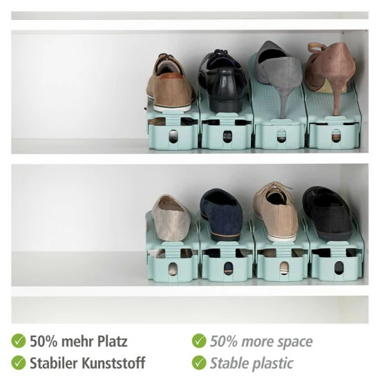 Mehr Platz und Ordnung im Schuhschrank gesucht? Der clevere Schuhhalter bietet 50 % mehr Platz im Schuhschrank. Die Schuhe werden ganz einfach paarweise übereinandergestapelt und können somit ordentlich und übersichtlich aufbewahrt werden. Die Schuhe werden vor Druckstellen und Kratzern geschützt und der Stauraum im Schuhschrank oder Schuhregal wird optimal genutzt.