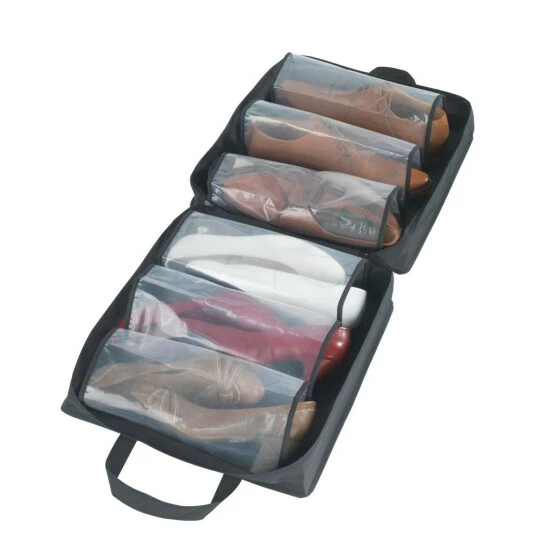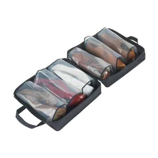 Die praktische Schuhtasche in dezentem Schwarz eignet sich optimal zur staubfreien Aufbewahrung oder auch als Reisebegleiter zum schonenden Transport von bis zu 3 Paar Schuhen. Diese werden einfach einzeln in die vorgesehenen, transparenten Fächer geschoben. Das schont Leder und Absätze.