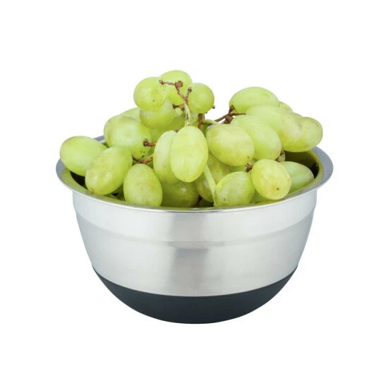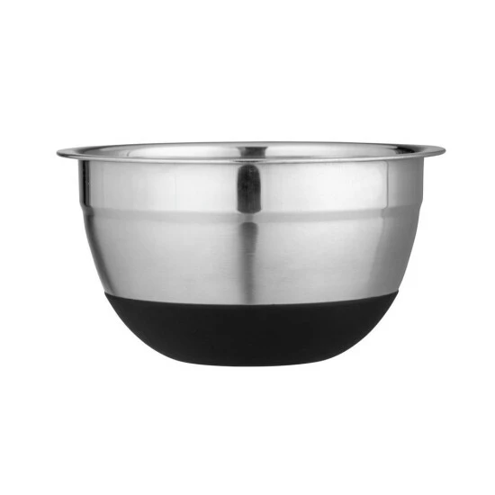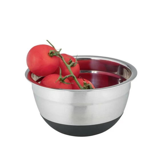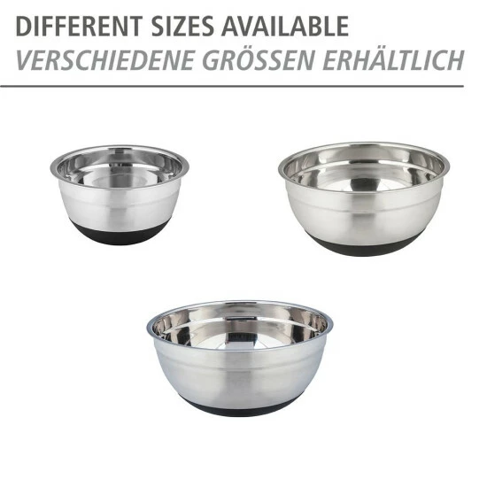 Funktional hat die Edelstahlschüssel ebenfalls so einiges zu bieten. Der Silikonboden ist rutschsicher, so steht die Schüssel während des Transportes auf dem Tablett sowie auf der Arbeitsplatte und dem Tisch jederzeit rutschfest an der gewünschten Stelle. Sobald die Rührschüssel leer ist, kann sie bequem in der Spülmaschine gereinigt werden. Ein weiteres Highlight des schwarzen, langlebigen Silikonbodens ist die Möglichkeit, die Schüsseln geräuschlos ineinander zu stellen. Denn die elegante Schüssel mit 0,6 Litern Volumen ist auch in den Größen 1,7 Liter und 4 Liter erhältlich. So können Sie die kleineren Varianten in die Größeren stellen und die Schalen platzsparend verstauen.