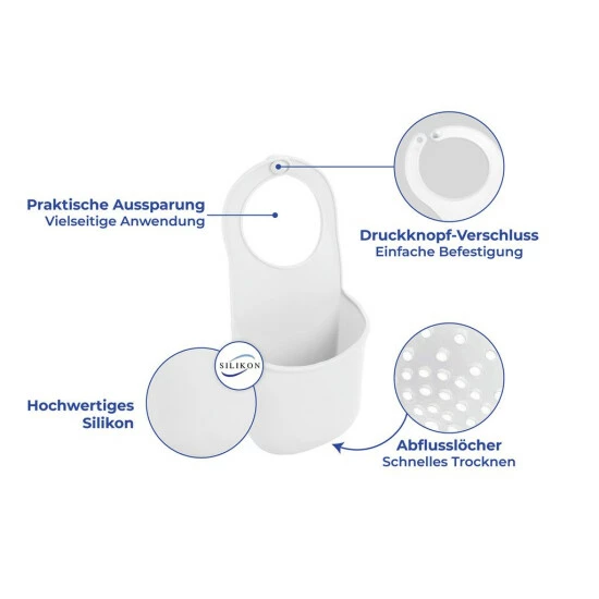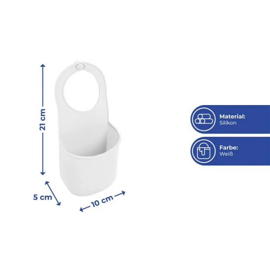 In dieser praktischen Tasche aus hochwertigem Silikon finden Seife, Schwamm und andere Helfer einen sauberen und ordentlichen Platz. Dank der kleinen Löcher am Boden kann das unnötige und überschüssige Wasser ablaufen und so liegen Seife, Schwamm und Co. griffbereit im Trockenen. Praktisch ist die Schwamm- und Seifenhalter auch für die Küche am Spülbecken oder alle anderen Orte, an denen Utensilien schnell trocknen müssen. Auch Duschgel und Shampoo können wie in einem Duschkorb aufbewahrt werden. Durch den cleveren Druckknopf-Verschluss ist die Schwamm- und Seifenhalterung schnell und sicher befestigt. Das klassische Weiß macht im gesamten Haushalt eine gute Figur.
