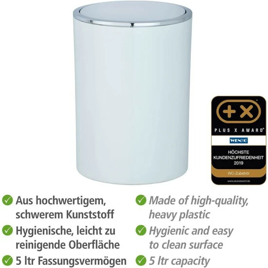 WENKO Kosmetikeimer Inca 5 Liter, Abfallbehälter mit Deckel fürs Gäste-WC, Badezimmer-Mülleimer mit Schwingdeckel, kleiner Abfalleimer aus Kunststoff, BPA-frei, Ø 18,5 x 25,5 cm, Weiß