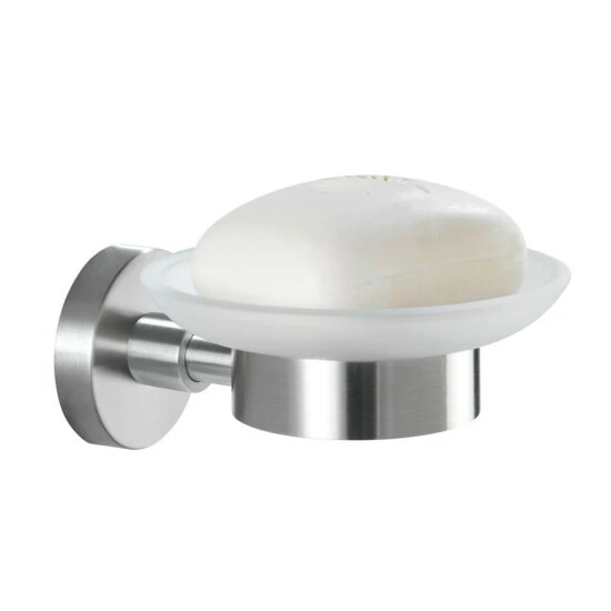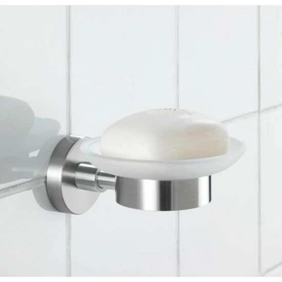 Hochwertige Seifenablage zur Aufbewahrung von Handseife mit abnehmbarer, satinierter Glasschale, aus rostfreiem, mattiertem Edelstahl, inklusive Montageset.