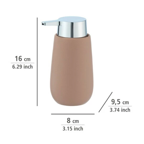 - Lieferumfang: Seifenspender Badi von WENKO in einem natürlichen Sandton, aus Keramik, Maße (B x H x T): 9,5 x 16 x 8 cm, Füllmenge ca. 320 ml.