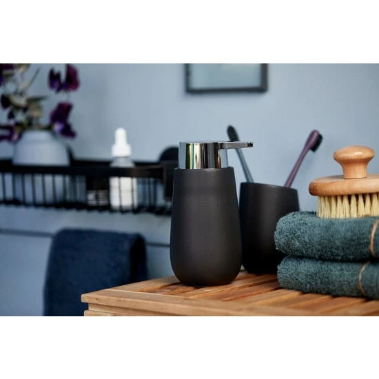 Flüssigseifenspender BADI, schwarz, WENKO In einem gut organisierten und ausgestatteten modernen Badezimmer kann es keinen Mangel an stilvollen Accessoires geben. Unter vielen Gruppen von Zubehör, Produkten und Gadgets wählen wir oft diejenigen aus, die nicht nur unsere ästhetischen Anforderungen erfüllen, sondern auch robust und praktisch sind. Dabei handelt es sich vor allem um Seifenspender, Zahnbürstenbehälter, Seifenschalen und verschiedene Kosmetikorganisatoren, in denen wir während der Pflege alle notwendigen kosmetischen Accessoires, Kosmetika und Hygieneprodukte aufbewahren.