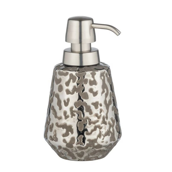 Der bezaubernde Seifenspender Burgos mit Glanzstruktur kann individuell mit bis zu 350 ml Flüssigseife oder Waschlotion gefüllt werden. Der komfortable Seifendosierer verfügt über einen silbernen, aus hochwertigem Kunststoff hergestelltem Pumpaufsatz. Durch leichten Druck auf den Dosierknopf in Edelstahl-Optik wird die gewünschte Menge Seife bzw. Lotion herausgepumpt. Mit seiner Abmessung von Ø 9,1 x 15 cm nimmt der Handseifenspender voller Eleganz seinen Platz auf Ihrem Waschbecken ein. Auch in der Küche kann die Pumpflasche ideal eingesetzt werden: mit Spülmittel befüllt, wird der Alltagshelfer zum dekorativen Highlight.