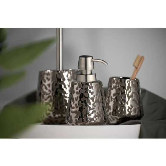 Mit ihrer unverwechselbaren Note werten die Elemente der Bad-Serie Burgos jedes Bad auf und verführen mit ausgefallenen, modernen Designs. Die anmutende Keramik-Serie mit brillantem Musterspiel verwandelt Ihr Badezimmer und Gäste-WC in eine Oase mit glanzvollem Auftritt. Gefertigt sind alle Accessoires aus hochwertiger Keramik, versehen mit einem Mix aus mattem Graubraun, glänzendem Finish in Platin sowie einer aufwendig strukturierten Oberfläche in Form einer filigran gezeichneten Struktur – geschaffen für alle, die sich nach etwas Besonderem sehnen.