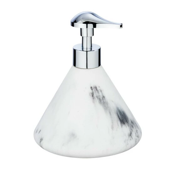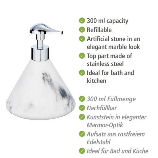 Desio Flüssigseifenspender Marke WENKO in weißem Marmor – weniger ist mehr! Der Spender verbindet Minimalismus mit Funktionalität: Seine sorgfältige Ausführung vermittelt dem Ganzen den Eindruck von unmittelmäßiger Eleganz. Mit diesem Zusatz kümmern Sie sich um die Hygiene in Ihrer Umgebung – wählen Sie diese, wenn Sie Wert auf Sauberkeit und Bequemlichkeit legen.