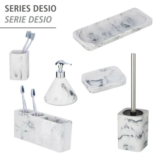 Aus der Serie Desio sind weitere Bad-Accessoires in modernem Marmor-Design erhältlich. Schaffen Sie sich Ihre entspannte Wohlfühloase und ergänzen Sie Ihre Badezimmer Einrichtung mit dem passenden Zahnputzbecher, Seifenschale, Utensilienhalter, WC-Garnitur und Badablage