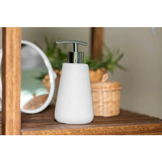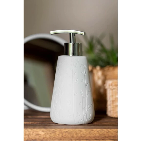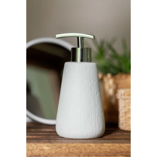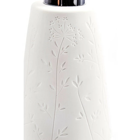Der dekorative Seifenspender Flora kann individuell mit 300 ml Flüssigseife oder Waschlotion gefüllt werden. Durch leichten Druck auf den Dosierknopf wird die gewünschte Menge Seife oder Lotion herausgepumpt.
