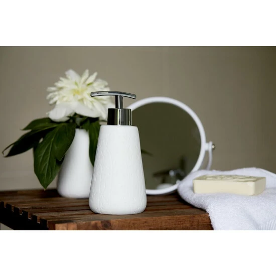 Durch die klare, weiße Farbgebung und das ausgefallene, zarte Blümchen-Relief schaffen die Accessoires ein stilsicheres Ambiente in jedem Badezimmer.