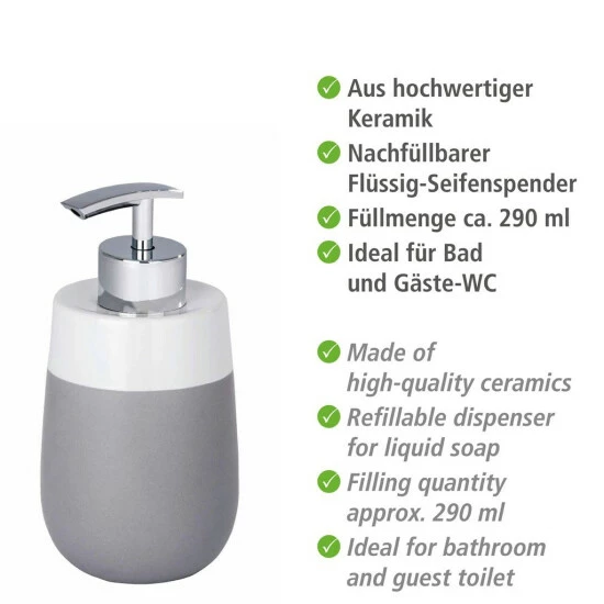 - Lieferumfang: Seifenspender Malta von WENKO, Flüssigseifenspender aus Keramik, Maße (B x H x T): 7,5 x 15 x 8 cm, Füllmenge 290 ml