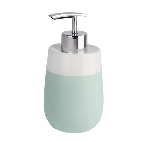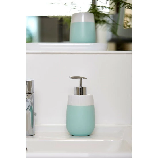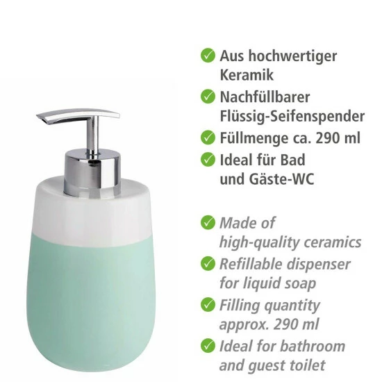 Auch im Gäste-WC oder in der Küche macht der charmante Seifenspender eine gute Figur. Seine sanfte Farbkombination Weiß/Mint und die besondere Gestaltung des Spenders sorgen dafür, dass dieses praktische Accessoire in jede Einrichtung mühelos integriert werden kann und sich dort ein wohltuender, beruhigender und optischer Ruhepol bildet.