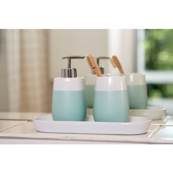 Durch die trendige Farbgebung im zarten Mint und Weiß verleihen die Accessoires jedem Badezimmer ein frisches Flair.