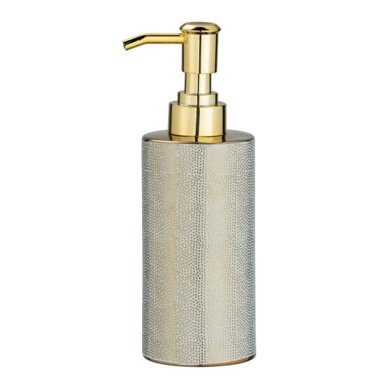 Der bezaubernde Seifenspender Nuria im glamourösen Gold/Weiß kann individuell mit bis zu 300 ml Flüssigseife oder Waschlotion gefüllt werden. Durch leichten Druck auf den Dosierknopf wird die gewünschte Menge Seife bzw. Lotion herausgepumpt.