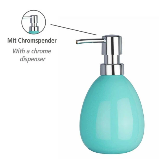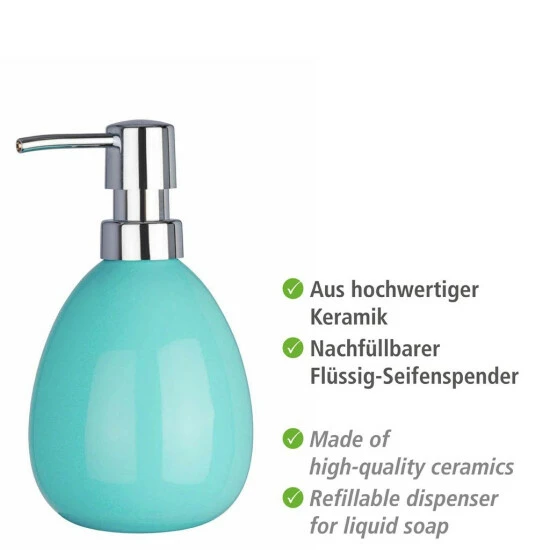 WENKO Seifenspender Polaris, nachfüllbarer Seifendosierer für Flüssigseife und Lotion aus hochwertiger Keramik, 10 x 16,5 x 9,4 cm, Füllmenge 390 ml, Pastell-Blau