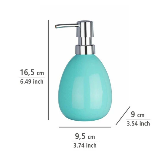 Der Seifenspender Polaris Pastel Blue kann individuell mit bis zu 390 ml Flüssigseife oder Waschlotion gefüllt werden. Durch leichten Druck auf den Dosierknopf wird die gewünschte Menge Seife oder Lotion herausgepumpt.