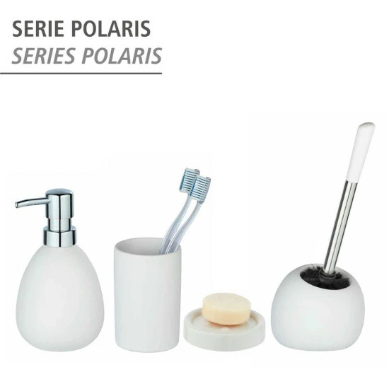 Ergänzend zu dem komfortablen Seifenspender hat WENKO auch die passende WC-Garnitur und den passenden Zahnputzbecher Polaris im Programm.