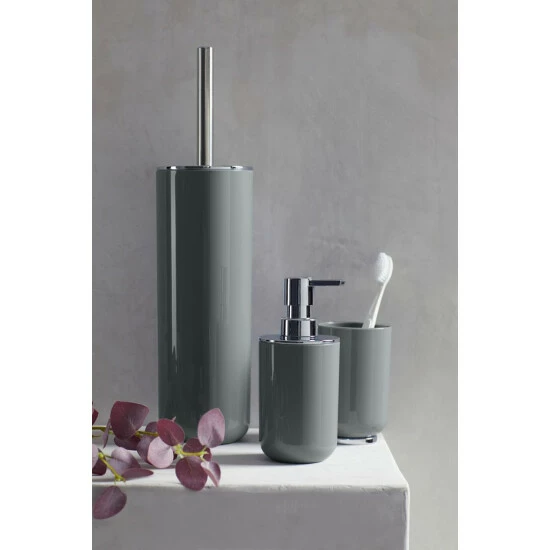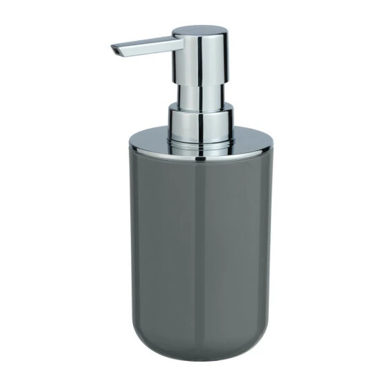 Der attraktive Seifenspender in trendigem Grau und die darauf abgestimmten Chrom-Highlights schaffen ein stilvolles Ambiente im Bad.
