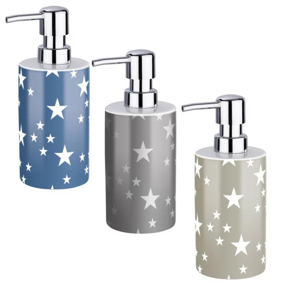 Keramikseifenspender aus der STELLA Badzubehör-Serie. Vervollkommnen Sie für ein modernes Badezimmer und mehr. Ermöglicht schnelles und bequemes Auftragen von Seife. Darüber hinaus funktioniert es gut als Spender für Geschirrspülmittel, Lotion, Shampoo usw. Entwickelt für Mehrfachbefüllung. Die Kapazität von 360 ml. Hergestellt aus hochwertiger Keramik. Taupefarben mit einem modischen Sternmotiv. Pumpe und Kunststoffdeckel stilisiert auf verchromtem Metall.