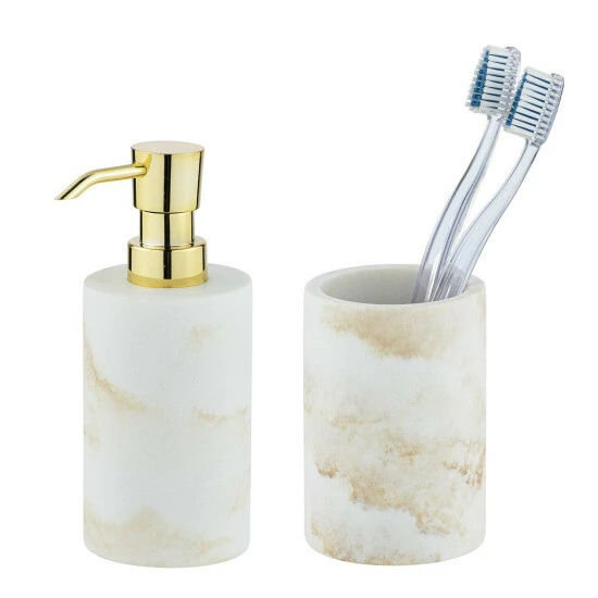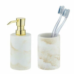Lieferumfang: 1 x Flüssigseifenspender, nachfüllbar mit Flüssigseife oder Desinfektionsmittel, Maße (B x H x T): 7 x 18 x 10 cm, Füllmenge 290 ml, 1 x Zahnputzbecher Odos, Zahnbecher in Marmor-Optik, aus Polyresin, Maße (B/T x H): Ø 8 x 11 cm