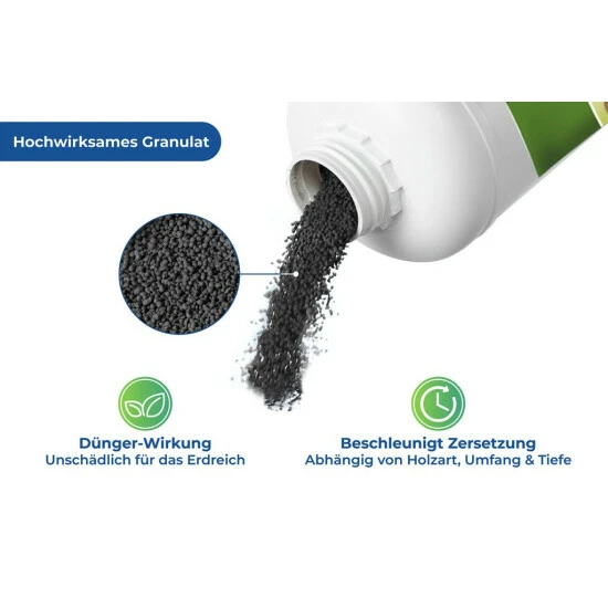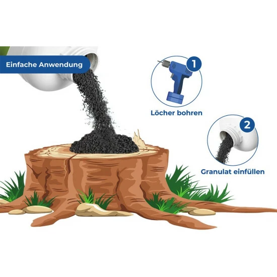 Einfach einige Löcher in den Stumpf bohren und das Granulat einfüllen. Bereits nach wenigen Monaten kann sich der Stumpf zersetzt haben (abhängig von Holzart, Umfang und Tiefe).