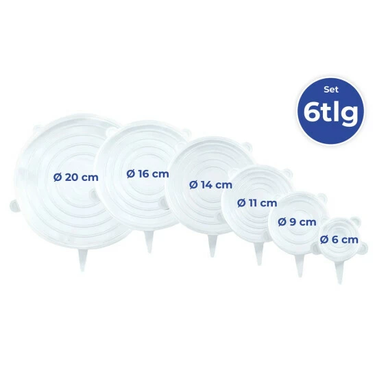 Die Deckel sind fest, dicht, geruchsresistent und vielseitig, z. B. können sie zum Verschließen von Lunchboxen oder Mittagessen sowie zum Schutz offener Dosen oder Konserven im Kühlschrank verwendet werden. Dank hochwertigem Kunststoff sind die Deckel resistent gegen Lebensmittelsäuren, die aus Früchten austreten können. Das Set enthält Deckel: 1 x ? 6 cm, 1 x ? 9 cm, 1 x ? 11 cm, 1 x ? 14 cm, 1 x ? 16 cm und 1 x ? 20 cm.