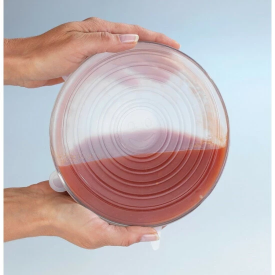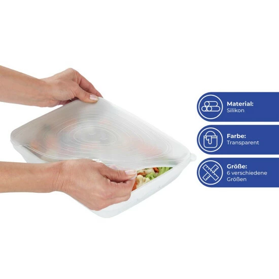 Ob eckig, oval oder rund, die elastischen Silikon-Abdeckhauben passen sich wunderbar jeder Form perfekt an. Diese Abdeckungen sind ein großartiger Aromaschutz für Ihre Lebensmittel. Sie verhindern unangenehme Geruchsbildung, Schimmel und Gefrierbrand.