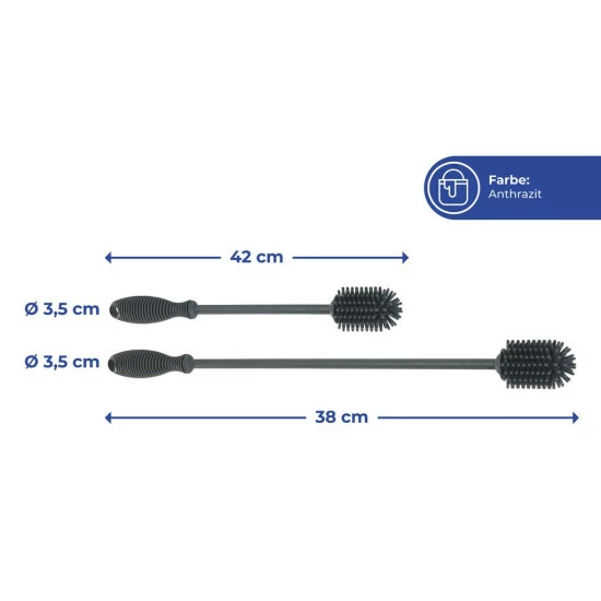 Eine Reihe von Silikonbürsten macht es einfach, Flaschen und andere Gerichte zu reinigen, die schwer mit einem traditionellen Schwamm zu waschen sind! Wenn Sie eine Person sind, die sich besonders um Sauberkeit kümmert, dann wird Ihnen eine Reihe von Silikonbürsten sicherlich gefallen. Die Produkte erleichtern die Reinigung schwer zugänglicher Stellen, da jeder von ihnen über einen praktischen Griff für eine einfache Handhabung verfügt. Sie werden ihre Aufgabe perfekt erfüllen, sowohl Flaschen, Gläser als auch andere Gerichte zu waschen, die mit einem traditionellen Schwamm schwer zu reinigen sind. Das Set enthält zwei Pinsel aus hochwertigem Silikon in dunkelgrau. Die Produkte unterscheiden sich in der Größe des Kopfes und der Länge des Griffs. Bürsten sind extrem leicht zu reinigen, alle Verschmutzungen werden unter fließendem Wasser abgewaschen. Am Ende jedes Griffs befindet sich ein Loch zum einfachen Aufhängen des Produkts auf dem Kleiderbügel.