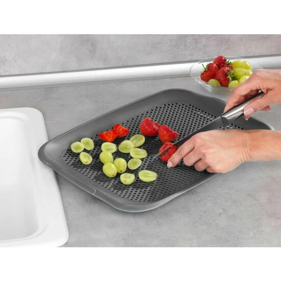 Dabei ist der praktische Küchenhelfer vielseitig einsetzbar: als Sieb zum Waschen von Obst und Gemüse, als Schneidbrett für die gewaschenen Nahrungsmittel oder zum Auffangen von Schälresten und Abfall.