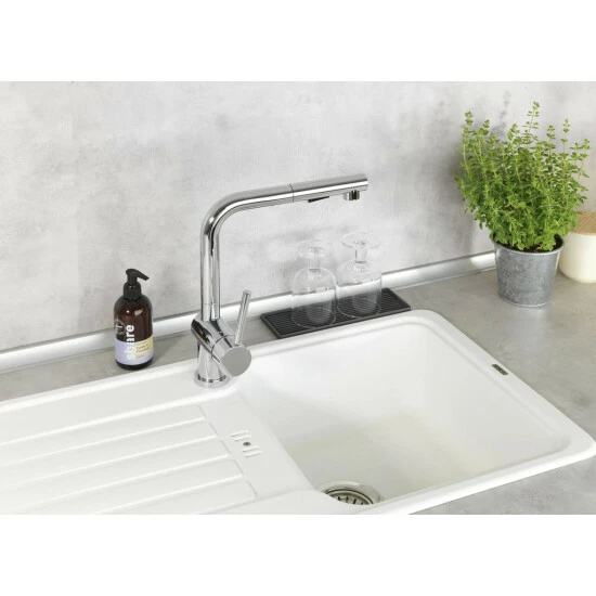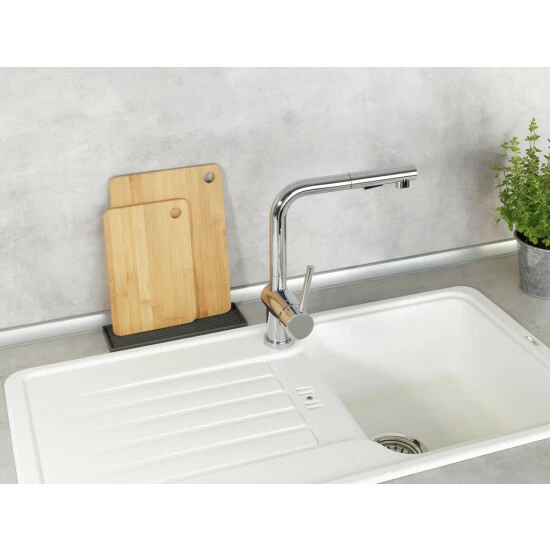 Die praktische Spülbeckenablage ist aus widerstandsfähigem Kunststoff gefertigt und somit ideal für den Nassbereich geeignet.