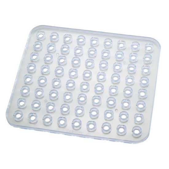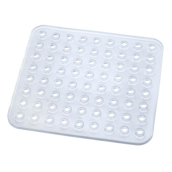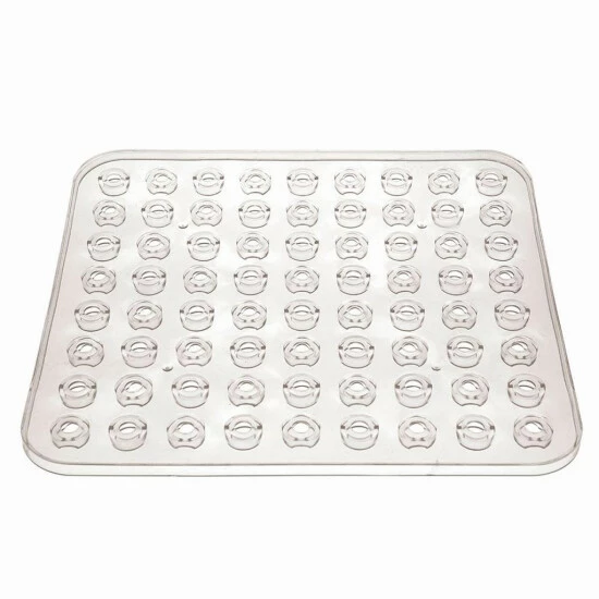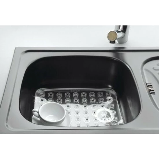 Es schützt auch die Wände der neuen Spüle vor Kratzern durch schwere Töpfe oder Pfannen. Es wird auch helfen, Kratzer oder Verfärbungen der alten Spüle zu verbergen. Das Pad besteht aus leicht zu reinigendem Kunststoff. Dickes, synthetisches Material , dank seines Gewichts und Saugnäpfen , haftet gut an der Unterseite der Spüle . Durchdie spezielle Anordnung der Aussparungen in den Saugnäpfen kann das Wasser schnell ablaufen. Dicht verlegte Löcher verhindern auch das Spritzen von Wasser und die Bildung von unschönen Flecken an den Wänden der Spüle. Die Matte hat Abmessungen 31×27,5 cm, passend für die meisten Waschbecken. Transparente und unaufdringliche Form macht die Mattein viele Stile der Küche passen, ohne ihr Konzept zu brechen.