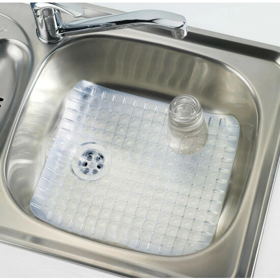 Das Gitter absorbiert den Sturz und die Gefäße bleiben ganz und unverzerkratzt. Ein weiterer Vorteil des Rostes ist, dass die Reste von Lebensmitteln oder Gemüsestücken oder Früchten darauf aufhören. Auf diese Weise gehen sie nicht in den Abfluss und führen nicht zu Verstopfung der Spüle oder unangenehmen Gerüchen. Das Gitter ist transparent, so dass es in jeder Spüle gut aussieht. Dank Universalmaßepasst er auf die meisten handelsüblichen Spülen.
