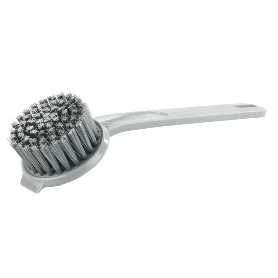 Mit einem Durchmesser von Ø 6 cm reinigt der runde Bürstenkopf mit seinen Borsten zum Beispiel Teller und Töpfe, die von Hand gespült werden. Der Bürstenkopf mit seinen Borsten und der Stiel bestehen aus Kunststoff. Besonders praktisch: Die insgesamt 21 cm lange Spülbürste hat einen integrierten Schaber, mit dem hartnäckige Schmutzrückstände entfernt werden können. Die kleine Kratzfläche aus Kunststoff kümmert sich um Eingetrocknetes und Angebranntes und hilft Ihnen bei der hygienischen Reinigung.