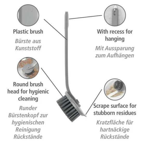 Die Spülbürste Simo von WENKO ist der ideale Küchenhelfer für das Spülen von Hand. Die graue Bürste reinigt Ihr Geschirr zuverlässig. Mit der integrierten Kratzfläche lassen sich hartnäckige Rückstände leichter entfernen.