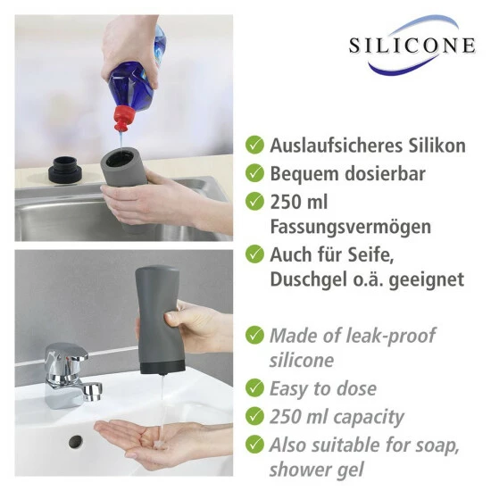 Der hochwertige Spender für Spülmittel, Seife, Duschgel und Lotion ist aus auslaufsicherem Silikon hergestellt und hält die gewünschte Flüssigkeit stets griffbereit in Küche, Bad und Gäste-WC.