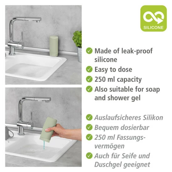 Der hochwertige Spender für Spülmittel, Seife, Duschgel und Lotion ist aus auslaufsicherem Silikon hergestellt und hält die gewünschte Flüssigkeit stets griffbereit in Küche, Bad und Gäste-WC.