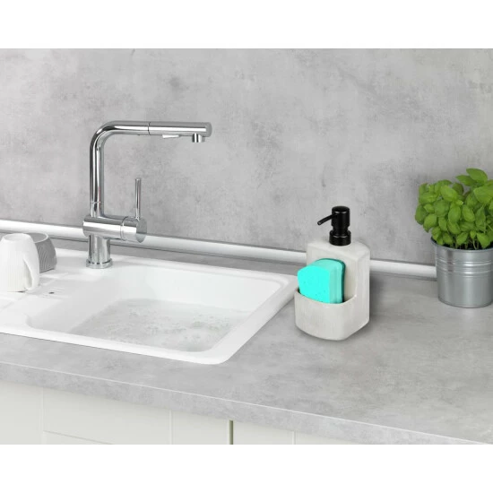Gut organisiert an der Küchenspüle – mit dem Spülmittelspender Festival von WENKO finden Spülmittel und Spülschwamm einen ansprechenden Platz und Ihr Spülbecken ist stets gut aufgeräumt.