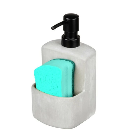 Der hochwertige Spülmittelspender Festival setzt auffallend schöne Akzente in minimalistischem hellgrauem Beton. Der Spender für Spülmittel mit Ablagefach hat eine kompakte Abmessung von (B x H x T) 10 x 18 x 10 cm und fasst großzügige 380 ml Flüssigseife oder Geschirrspülmittel. Durch die praktische Ablage haben Sie den Spülschwamm schnell zur Hand und können ihn nach dem Spülen in dem integrierten Ablagefach ganz bequem zum Trocknen ablegen.
