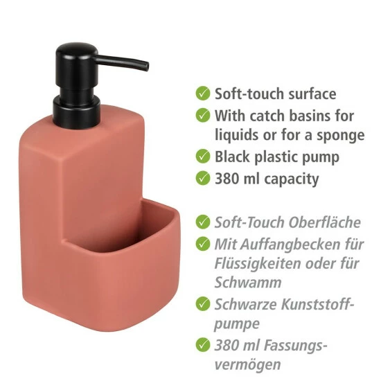 Der dekorative Seifenspender kann individuell mit bis zu ca. 380 ml Spülmittel oder Flüssigseife gefüllt werden. Durch leichten Druck auf den Dosierknopf wird die gewünschte Menge Spülmittel herausgepumpt.