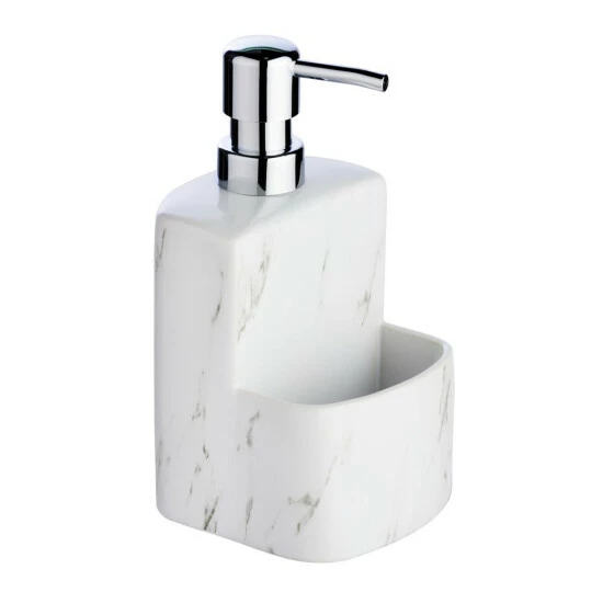 FESTIVAL Flüssigseifenspender mit Schwammbehälter, Marmorkeramik, 380 ml Marke WENKO ist ein universelles Gerät, das nicht nur in Ihrem Badezimmer, sondern auch in Ihrer Küche, Waschküche oder Hauswirtschaftsraum verwendet werden kann. Dank der kompakten Abmessungen passt es in jeden, auch kleinen Raum. Sie können Seife, Spülmittel, Händedesinfektionsmittel und sogar feuchtigkeitsspendende Lotion für trockene Hände hineingeben.