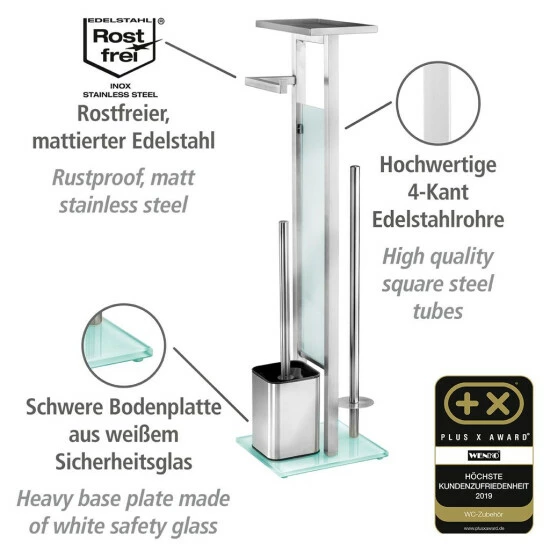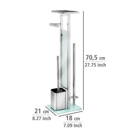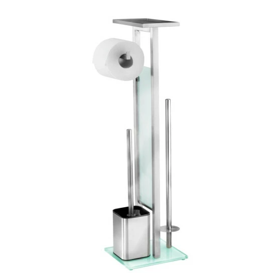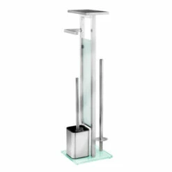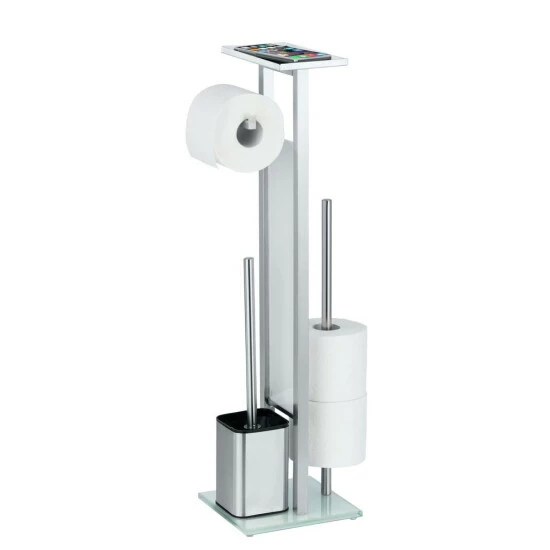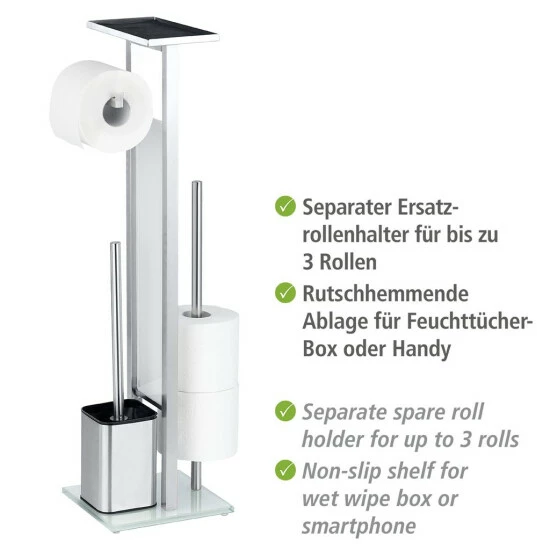 Sie ist eine praktische 4 in 1 Kombination bestehend aus einem offenen WC-Bürstenhalter, einem Toilettenpapierrollenhalter für die sofortige Entnahme und einem separaten Ersatzrollenhalter für die Aufbewahrung von bis zu 3 weiteren Rollen. Zusätzlichen Komfort bietet die praktische Ablage für eine Feuchttücher-Box oder andere Utensilien, z.B. Handy, etc. Natürlich ist die Ablage rutschhemmend beschichtet. Ein quadratischer Standfuß aus weißem Sicherheitsglas sorgt durch seine perfekte Größe für sicheren Stand.
